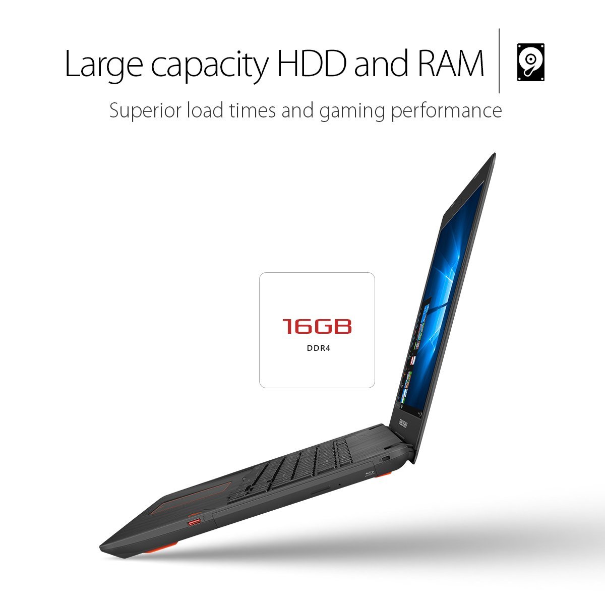 Экран ASUS FX753VD-GC256T на основе матрицы TN+film поддерживает разрешение 1920x1080. Преимущество модели в поддержке не только жесткого диска HDD на 1 ТБ, но и SSD на 128 ГБ, что позволит загружать объемные приложения и сохранять большие объемы информации. Ноутбук с поддержкой Wi-Fi оборудован оптическим приводом DVD-SMulti и функционирует на основе системы Windows 10. Клавиатура аппарата создана специально для игр, о чем говорит выделение навигационной группы клавиш WASD.